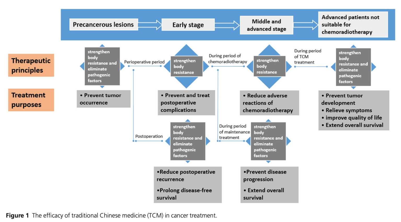 Treatment strategies, which centres around the key philosophical concepts of TCM place strong emphasis on the goal of “the combination of partial and systemic therapy, strengthening body resistance and eliminating pathogens, treatment of the body, and the regulation of emotion”. Through the various research conducted especially since the founding of the People's Republic of China, it has been proven that TCM is highly compatible with modern cancer treatment. The combination of treatment boosts the chance of patient recovery through alleviating side-effects of western treatment, which in turn enhances the quality of life, prevents the relapse of cancer. (Liu, et al., 2015)